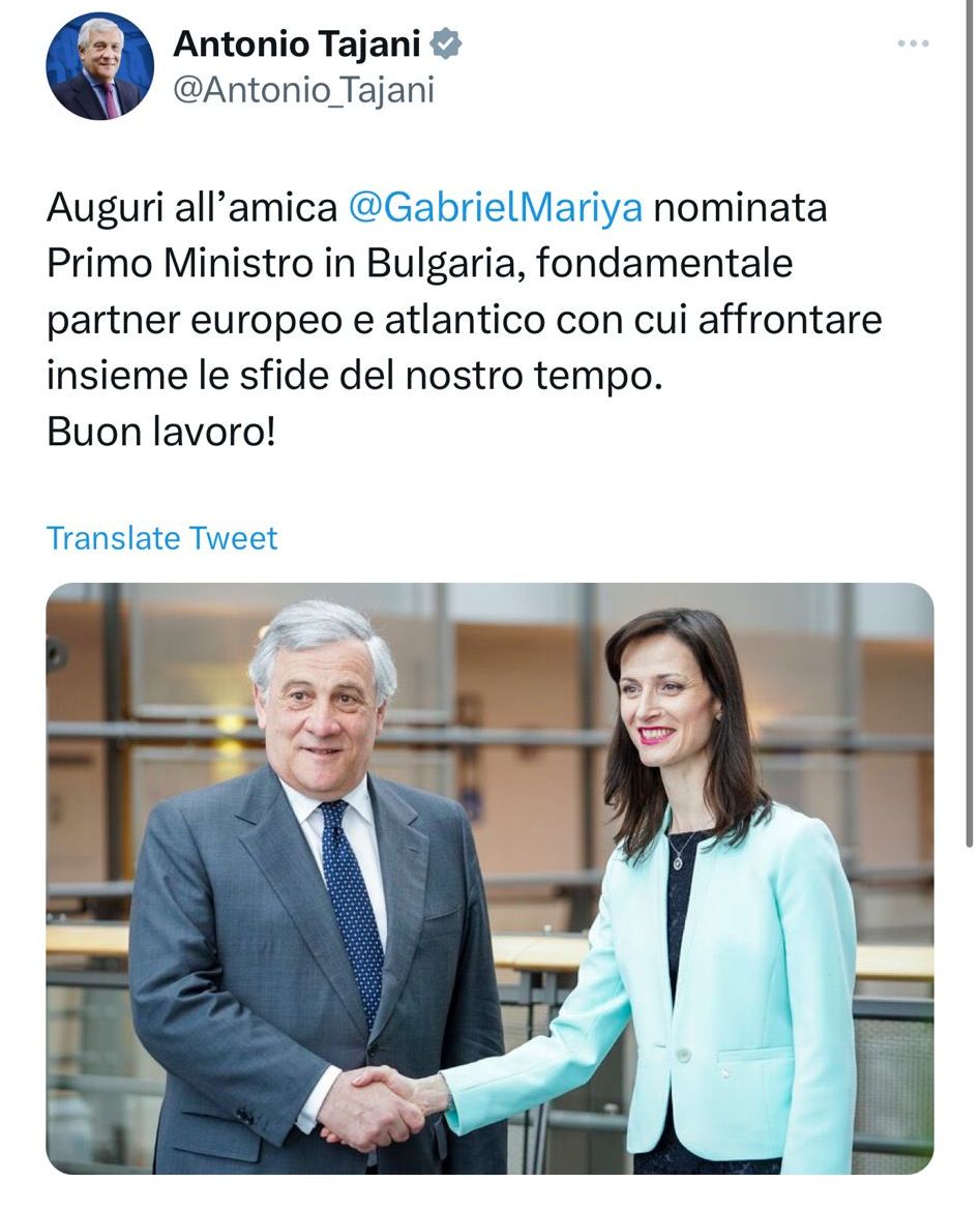 Външният министър на Италия и бивш колега на Мария Габриел Антонио Таяни също я поздрави.