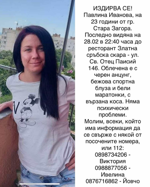 Павлина Иванова е на 23 години от град Стара Загора. Последно видяна на 28.02. в 22:40 часа до ресторант на улица "Св. Отец Паисий" №146.