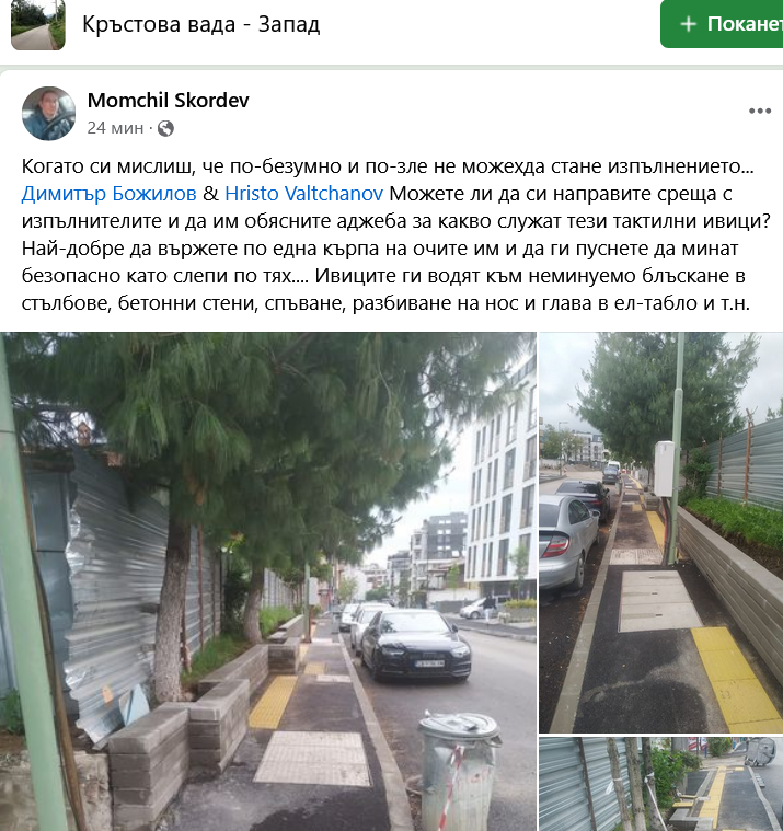 Димитър Божилов & Hristo Valtchanov Можете ли да си направите среща с изпълнителите и да им обясните аджеба за какво служат тези тактилни ивици? Най-добре да вържете по една кърпа на очите им и да ги пуснете да минат безопасно като слепи по тях.... Ивиците ги водят към неминуемо блъскане в стълбове, бетонни стени, спъване, разбиване на нос и глава в ел-табло и т.н.