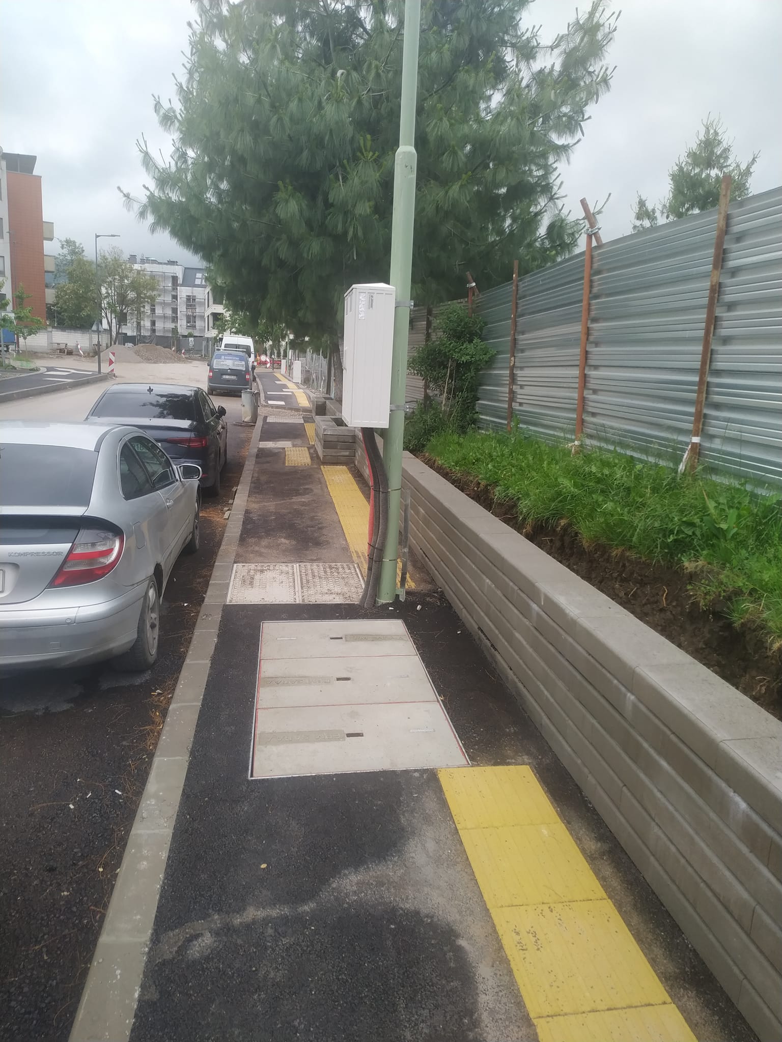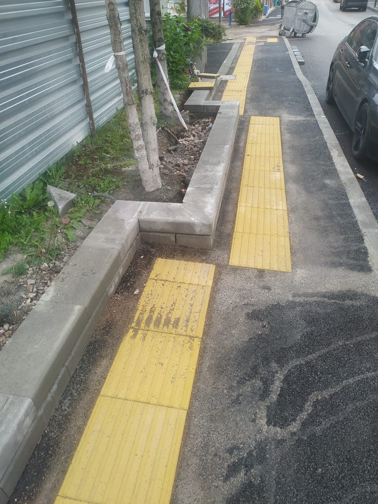 По "ремонтираните" тротоари са поставени плочки с тактилни ивици за незрящи, които водят за никъде...всъщност не съвсем за никъде, те водят към бордюри, дървета и стълбове. Това е доста опасно за незрящ. Вместо тактилните ивици да му показват пътя и безопасната посока, те го водят към поредица опасности и препятствия.