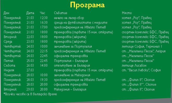 Проверката с Португалия е на 25 март от 22:45 часа, а с Македония на 29 март от 20:00 часа.