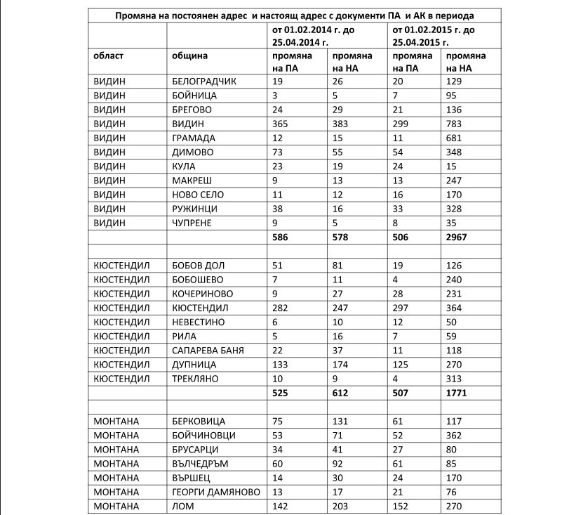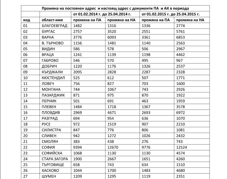 Забележка: От справката е видно, че съществени разлики в броя на лицата, променили постоянния си адрес в периода от 01.02. до 25.04. през 2014 г. и 2015 г., няма.