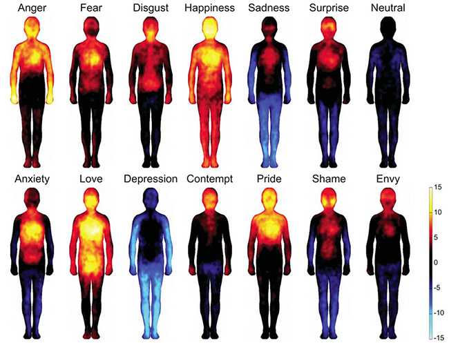 Тялото ни "усеща" различните емоции с различни свои части. Например - притеснение чрез свиване и трептене на стомаха, срам - чрез почервяване на бузите и т.н.