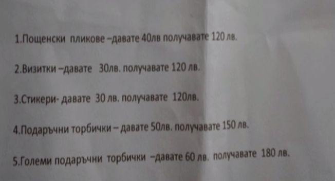 За преведената първоначална вноска от 7 лева се получава списък с материали за консумативите, които трябва да се изработят вкъщи. За да започнем реално работа обаче, трябва да платим и тях. Те са на стойност между 30 и 60 лева, а в брошурата се твърди, че можем да изкараме минимум 120 лева печалба. Уловката е там, че никой работник не се оказва достатъчно добър, за да произведе „качествената” продукция, която шефовете очакват.