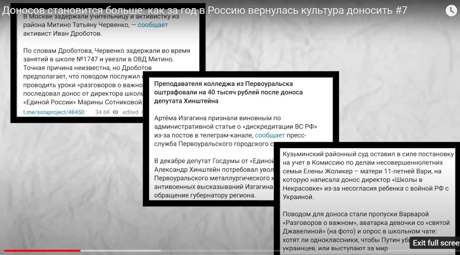 Единственият случай, при който е пострадал доносникът е този, в който беше представено искане за образуване на дело срещу Владимир Путин, тъй като нарече войната в Украйна война. По време на пресконференция на 22 декември 2022 г. руският президент заяви, че "Русия се стреми да завърши войната по-бързо." Тогава общинският депутат от Санкт Петербург Никита Юферев се обърна към прокуратурата и министерството на вътрешните работи с искането срещу Путин да бъде образувано наказателно дело "за разпространение на фейкове за руската армия". Той припомни, че по този повод в страната вече са осъдени хиляди. В крайна сметка Юферев бе обвинен в "държавна измяна" и глобен с 46 хил. рубли.