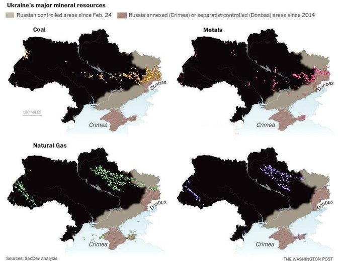Украйна е широко известна като селскостопанска сила. Но като източник на основни суровини, страната има находища на 117 от 120-те най-широко използвани минерали и метали и е основен източник на изкопаеми горива. Официалните уебсайтове вече не показват геолокациите на тези находища - правителството, позовавайки се на националната сигурност, ги свали в началото на пролетта. Но анализът на SecDev показва, че под руски контрол в момента се намират украински енергийни и минерални залежи на стойност поне 12,4 трилиона долара. Това е почти половината от доларовата стойност на 2209 депозита, прегледани от компанията. В допълнение към 63 процента от находищата на въглища в страната, Москва контролира 11 на сто от находищата на петрол, 20 на то от находищата на природен газ, 42 на сто от металите и 33 на сто от находищата на редки и други важни минерали, включително литий. Някои от тях са трудни за достигане, а някои са загубени още при анексията на Крим или водената осемгодишна война с проруските сепаратисти в източната част на страната.