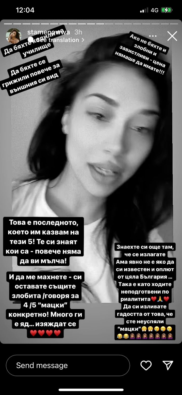 "И да ме махнете си оставате същите злобита - говоря за 4/5 "мацки" конкретно! Много ги е яд... изяждат се", споделя Стаменова в едно от сторитата си.
