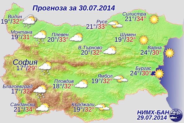 До полунощ преваляванията и гръмотевиците ще престанат, ще започне и намаление на облачността. Сутринта по-значителна облачност ще има само над западните и централни райони от Дунавската равнина, към обяд временно ще намалее.