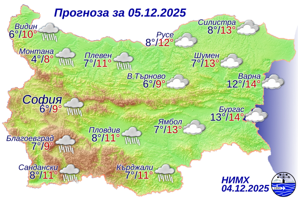 Атмосферното налягане е и ще остане по-ниско от средното за месеца. Ще остане облачно. На много места в западната половина от страната ще вали дъжд. Значителни по количество ще са валежите в югозападните райони. Ще духа умерен, в източните райони и временно силен източен вятър. Минималните температури ще бъдат между 4° и 9°, за София - около 6°, максималните - между 8° и 13°, за София - около 9°, сочи прогнозата на НИМХ.