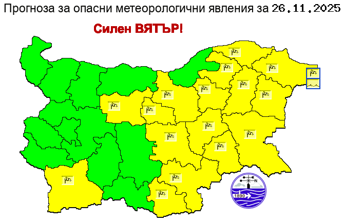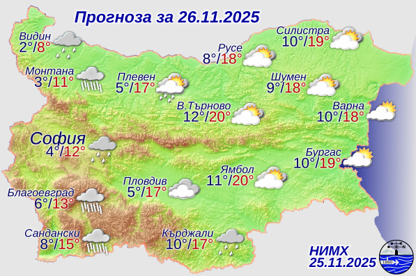 През днешния ден над западната половина от страната ще е предимно облачно и на много места ще има валежи от дъжд, по-значителни в крайните западни и южни райони. Над Източна България облачността ще е разкъсана, там ще духа умерен и временно силен южен вятър. В Западна България вятърът ще се ориентира от северозапад и с него ще започне да нахлува студен въздух. Минималните температури ще бъдат предимно между 3° и 8°, в районите с вятър – до 10°-12°; в София – около 4°. Максималните температури ще бъдат в широк интервал: от 7°-8° в крайните северозападни райони до 18°-20° на места в Източна България и районите, чувствителни на южен вятър, в София – около 12°. Това съобщават от Националния институт по метеорология и хидрология (НИМХ).