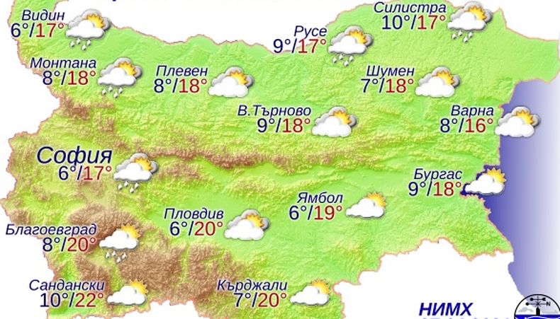 Облачността днес ще е разкъсана, над много райони по-често значителна и на отделни места в северозападната половина от страната ще превали слаб дъжд. Това съобщиха от Националния институт по метеорология и хидрология (НИМХ), цитирани от „Фокус”. След обяд вятърът ще се ориентира от североизток, вечерта от изток и ще бъде слаб до умерен. Максималните температури се очаква да достигнат между 17  и 22 градуса.