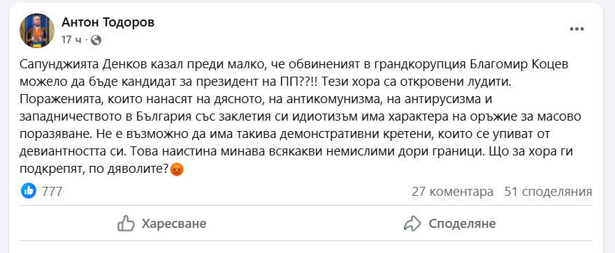 "Сапунджията Денков казал преди малко, че обвиненият в грандкорупция Благомир Коцев можело да бъде кандидат за президент на ПП??!! Тези хора са откровени луди. Пораженията, които нанасят на дясното, на антикомунизма, на антирусизма и западничеството в България със заклетия си идиотизъм има характера на оръжие за масово поразяване.