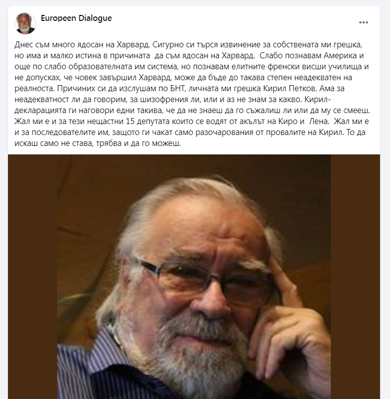 "Днес съм много ядосан на Харвард. Сигурно си търся извинение за собствената ми грешка, но има и малко истина в причината да съм ядосан на Харвард. Слабо познавам Америка и още по-слабо образователната им система, но познавам елитните френски висши училища и не допусках, че човек завършил Харвард, може да бъде до такава степен неадекватен на реалността. Причиних си да изслушам по БНТ личната ми грешка Кирил Петков.