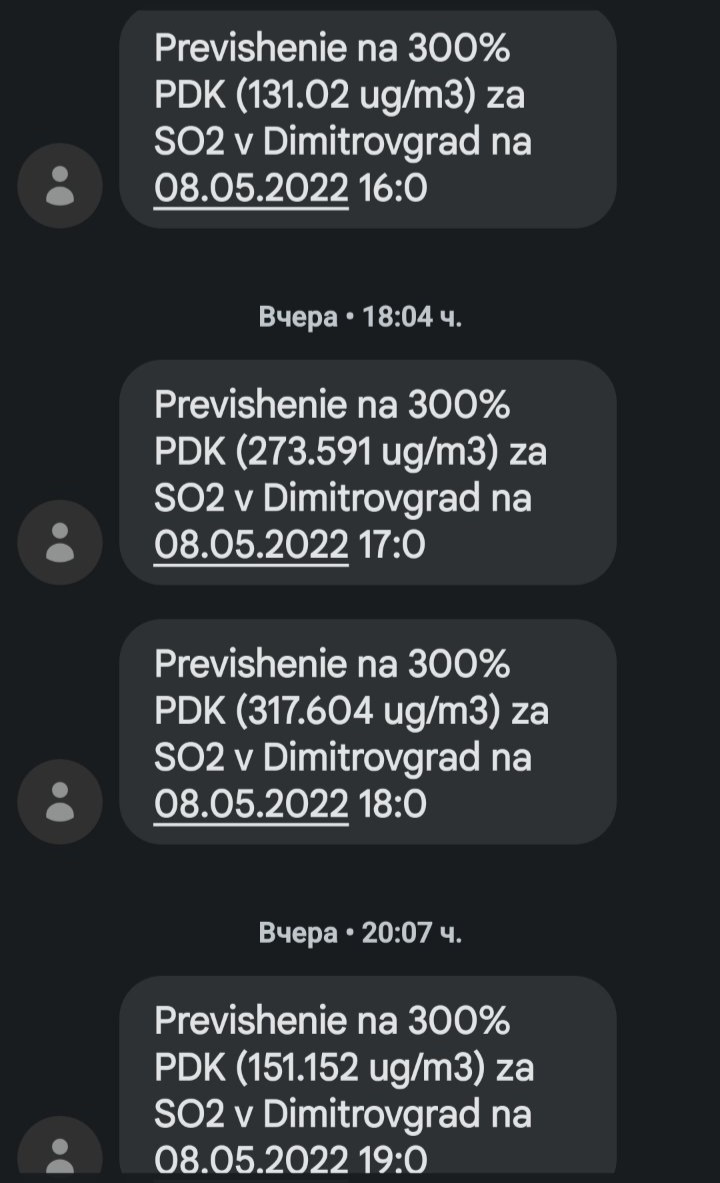 За 6-ти пореден ден в Димитровград са отчетени завишения на нормите на серен диоксид над разрешените стойности. Хората продължават да задават въпроса „Кой замърсява Димитровград?“, след като нарочената за основен замърсител на въздуха в града ТЕЦ „Марица 3“ повече от две седмици е спряна от дейност. Димитровградчани още чакат отговор от институциите за поредното превишение на допустимите количества серен диоксид в атмосферния въздух и покрива ли се умишлено истинският замърсител на града.
