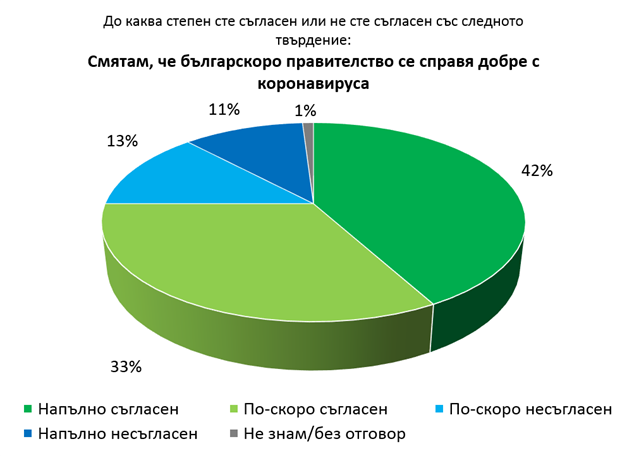 Общо 75% са по-скоро съгласни или напълно съгласни, че българското правителство се справя добре в ситуацията с коронавируса. 24% са по-скоро или напълно несъгласни. Има и съвсем малък дял затрудняващи се да отговорят. На практика, и тук няма съществена промяна спрямо предходната вълна на сондаж преди седмица и оценката за правителството остава силно положителна. Тя се повиши с взетите мерки през март, след което се установи трайно на нивата над 70% в различните ресори дори и над 80% - когато става дума за щаба. Тепърва ще се види дали ще се задълбочава обичайната в такива случаи плавна ерозия.
