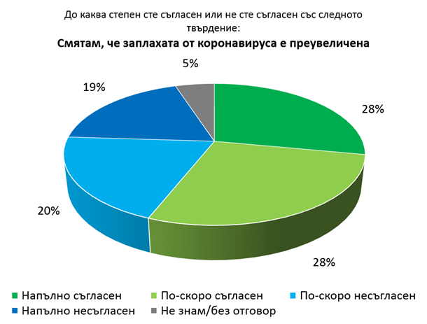 56% продължават да намират заплахата за преувеличена. И тук няма сериозна промяна спрямо последната вълна на изследване. 39% са на различното мнение или дори на диаметрално противоположното. Българите остават сред обществата, които донякъде се съмняват в заплахата – на фона на света. Това съмнение спадна в началото на извънредното положение с ръста на броя заразени, но и сега остава сравнително високо, макар и да не бележи нов ръст.