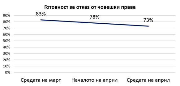 Както беше отбелязано и в предходната вълна на изследване, леко намалява делът на готовите да се разделят с част от правата си в името на борбата с коронавируса – на фона на обратна тенденция в много други страни. Общо 73% сега са по-скоро съгласни или напълно съгласни да жертват права, а 24% са несъгласни или съвсем несъгласни. 3% не могат да преценят. Делът на готовите да жертват права остава висок, но намалява от седмици насам – преди извънредното положение делът на съгласните беше 83%, преди седмица пък вече беше 78%. Вероятно и тук личи известно успокоение, на фона на оценяваните досега като успешни мерки от страна на държавата. Ниският (досега) ръст на заболеваемостта може би създава възможност за поява на повече критика към властта и алтернативни гледни точки.