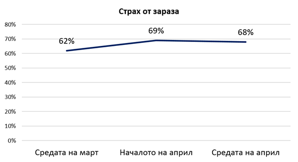 68% от българите заявяват, че се боят или че даже много се боят, че може те или семействата им да се заразят с коронавируса. 29% твърдят, че не се боят или даже никак не се боят. 3% се затрудняват да отговорят. Регистрираната тревога е по-висока, в сравнение с времето преди въвеждането на извънредното положение, но е почти идентична с тази от миналата седмица. Уплахата се увеличи в началото на извънредното положение, но засега е спряла своя ръст.