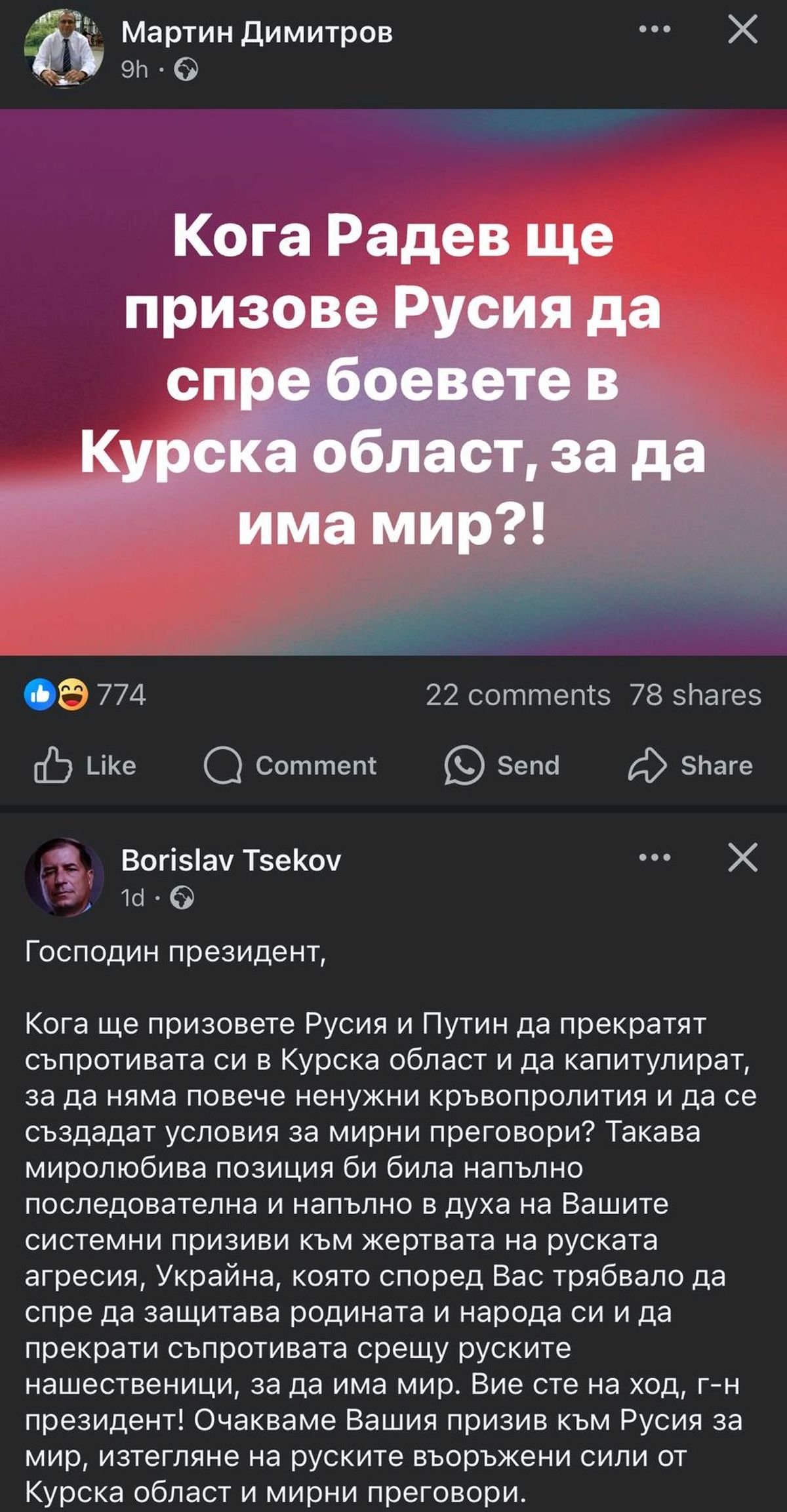 Народният избраник попита във "Фейсбук": "Кога Радев ще призове Русия да спре боевете в Курска област, за да има мир?! - едно към едно думи на конституционалиста, публикувани вече в неговия профил ден по-рано, и ги представи за свои.