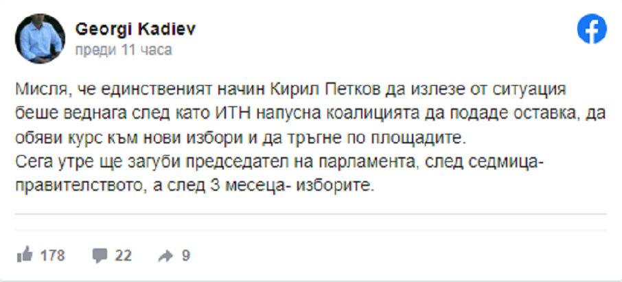 Сега утре ще загуби председател на парламента, след седмица- правителството, а след 3 месеца- изборите“, написа Георги Кадиев във Фейсбук.