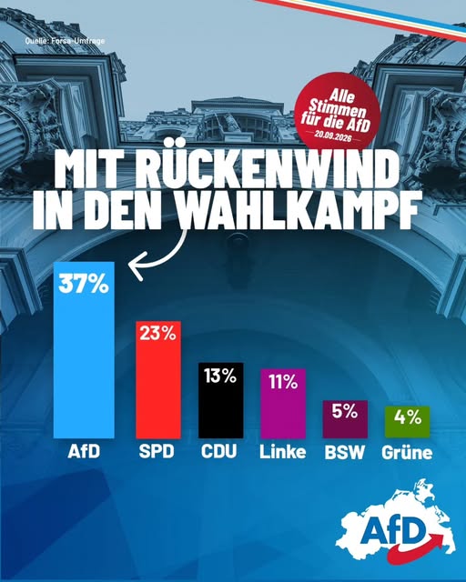 Бай Радан вика, че възход на Алтернатива за Германия, ще има на куково лято! Уважаеми читатели, кувото лято наближава! Запомнете 6 септември и 20 септември тази година. Ще видите как AFD ще помете ХДС в Саксония-Анхалт и Мекленбург-Предна Померания. Шверин, Рощок, Магдебург и Хале ще са царство на АФД и ще бъдат последвани от Дрезден, Лайпциг, Гера, Йена, Кемниц, Ерфрут, Цвикау...
