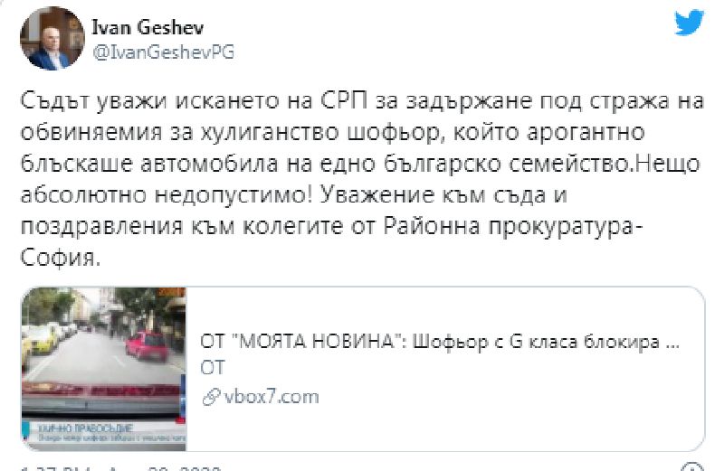 Съдът уважи искането на Сoфийската районна прокуратура за задържане под стража на шофьора G класата, блъскал друга кола в София. Това съобщи главният прокурор Иван Гешев в Twitter. Той поздрави колегите си от Районна прокуратура-София, а инцидента окачестви като "нещо абсолютно недопустимо".