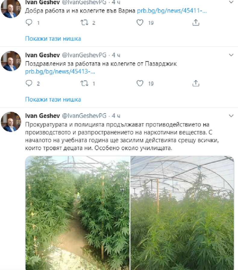 "Прокуратурата и полицията продължават противодействието на производството и разпространението на наркотични вещества. С началото на учебната година ще засилим действията срещу всички, които тровят децата ни. Особено около училищата", написа Гешев в Туитър.