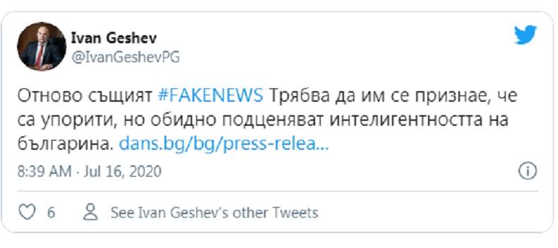 "Отново същият #FAKE NEWS трябва да им се признае, че са упорити, но обидно подценяват интелигентността на българина", написа обвинител номер 1.