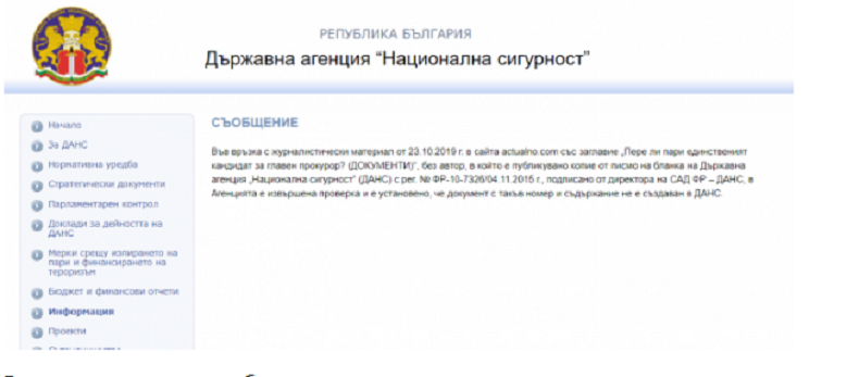 "Във връзка с журналистически материал от 23.10.2019 г. в сайта actualno.com със заглавие „Пере ли пари единственият кандидат за главен прокурор? (ДОКУМЕНТИ)”, без автор, в който е публикувано копие от писмо на бланка на Държавна агенция "Национална сигурност” (ДАНС) с рег. № ФР-10-7326/04.11.2015 г., подписано от директора на САД ФР – ДАНС, в Агенцията е извършена проверка и е установено, че документ с такъв номер и съдържание не е създаван в ДАНС", пишат от агенцията.