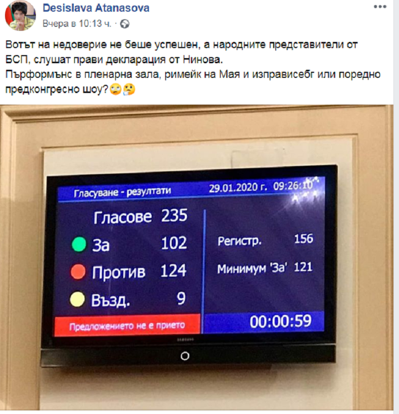 "Вотът на недоверие не беше успешен, а народните представители от БСП, слушат прави декларация от Нинова.