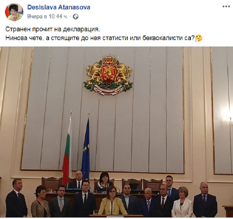 "Странен прочит на декларация. Нинова чете, а стоящите до нея статисти или беквокалисти са?", попита във Фейсбук Атанасова.