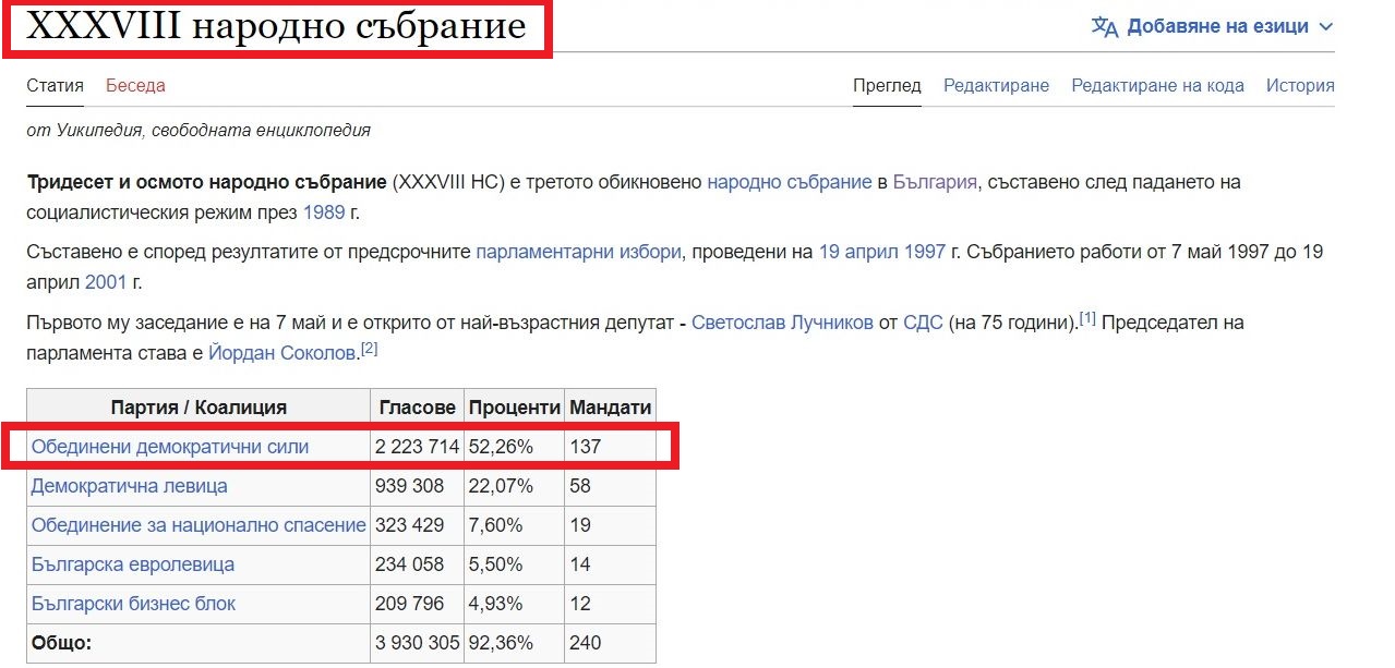 За последно с най-много - 137 мандата (скрийншот 1), са разполагали от Обединени демократични сили в 38-то Народно събрание, което работи от 1997 до 2001 г.