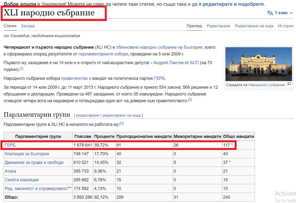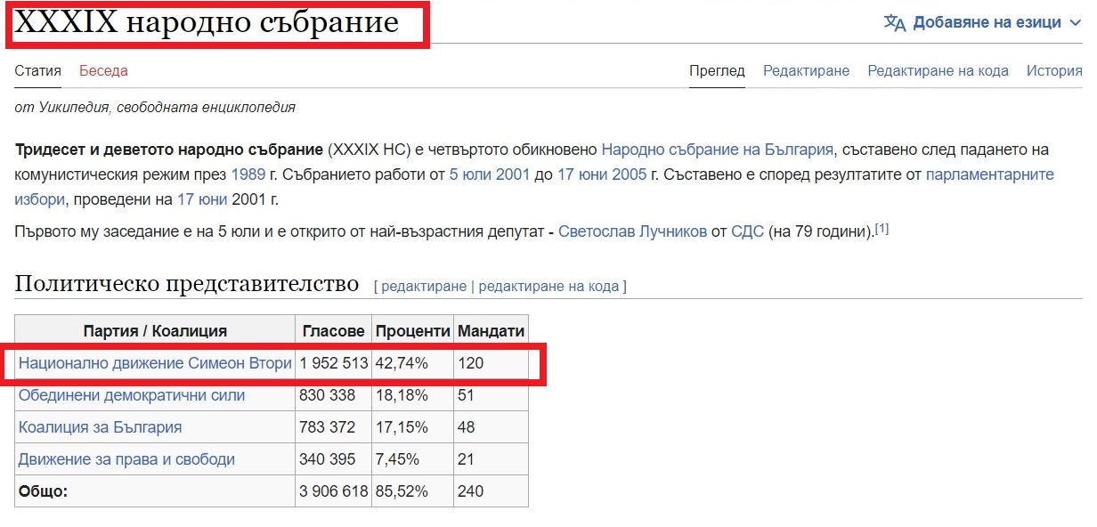 В следващия парламент (2001 до 2005 г.) 120 мандата (скрийншот 2) е имало "Национално движение Симеон Втори". А през 2009 г., когато ГЕРБ печели за пръв път парламентарните избори, партията влиза в 41-то Народно събрание със 117 мандата - на третия скрийншот. Важно е да се отбележи, че ОДС печели 137-те мандата с 2 223 714 гласа, НДСВ своите 120 мандата с 1 952 512 гласа, а през 2009 г. ГЕРБ получава своите 117 мандата с 1 678 641 гласа.