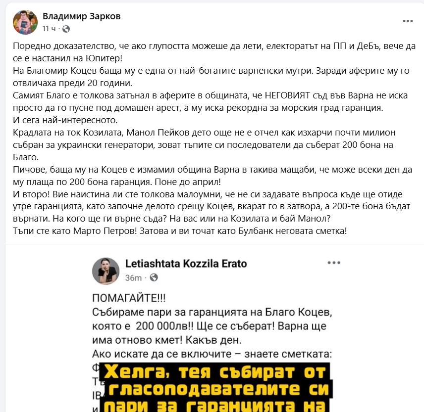 Крадлата на ток Козилата, Манол Пейков дето още не е отчел как изхарчи почти милион събран за украински генератори, зоват тъпите си последователи да съберат 200 бона на Благо. Пичове, баща му на Коцев е измамил община Варна в такива мащаби, че може всеки ден да му плаща по 200 бона гаранция. Поне до април!