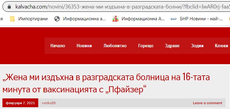Така някакъв си сайт Кълвача.ком популяризира менте новина за починала след ваксиниране жена. Такъв случай в България не е споменаван никъде, нито е съобщен по официални канали, а е ясно, че вести за смърт, особено покрай пандемията, не могат да се скрият и подобни факти биха гръмнали в медиите с пълна сила.
