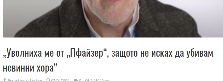 Друго менте, което невежи потребители на Фейсбук търкалят от стена на стена е изказване на служител на "Пфайзер". Само никому неизвестните сайтове zona98 и novini.store лансират, че уж някой си професор заявил, че напуска компанията, тъй като ваксината може да убие човек.