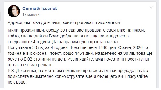 "Мили продажници, срещу 30 лева вие продавате своя глас на някой, който, ако не дай си Боже дойде на власт, ще ви мандръса в следващите 4 години. Да направим една проста сметка: