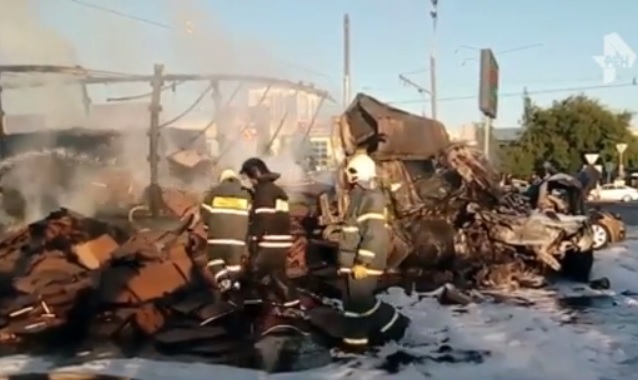 Един човек загина, а трима бяха ранени, след като 4 коли и 2 камиона се удариха на булевард Варшавское шосе в Москва. Избухнал е и пожар, в резултат на който единият камион и няколко колиса изгорели. Сред пострадалите има и дете.