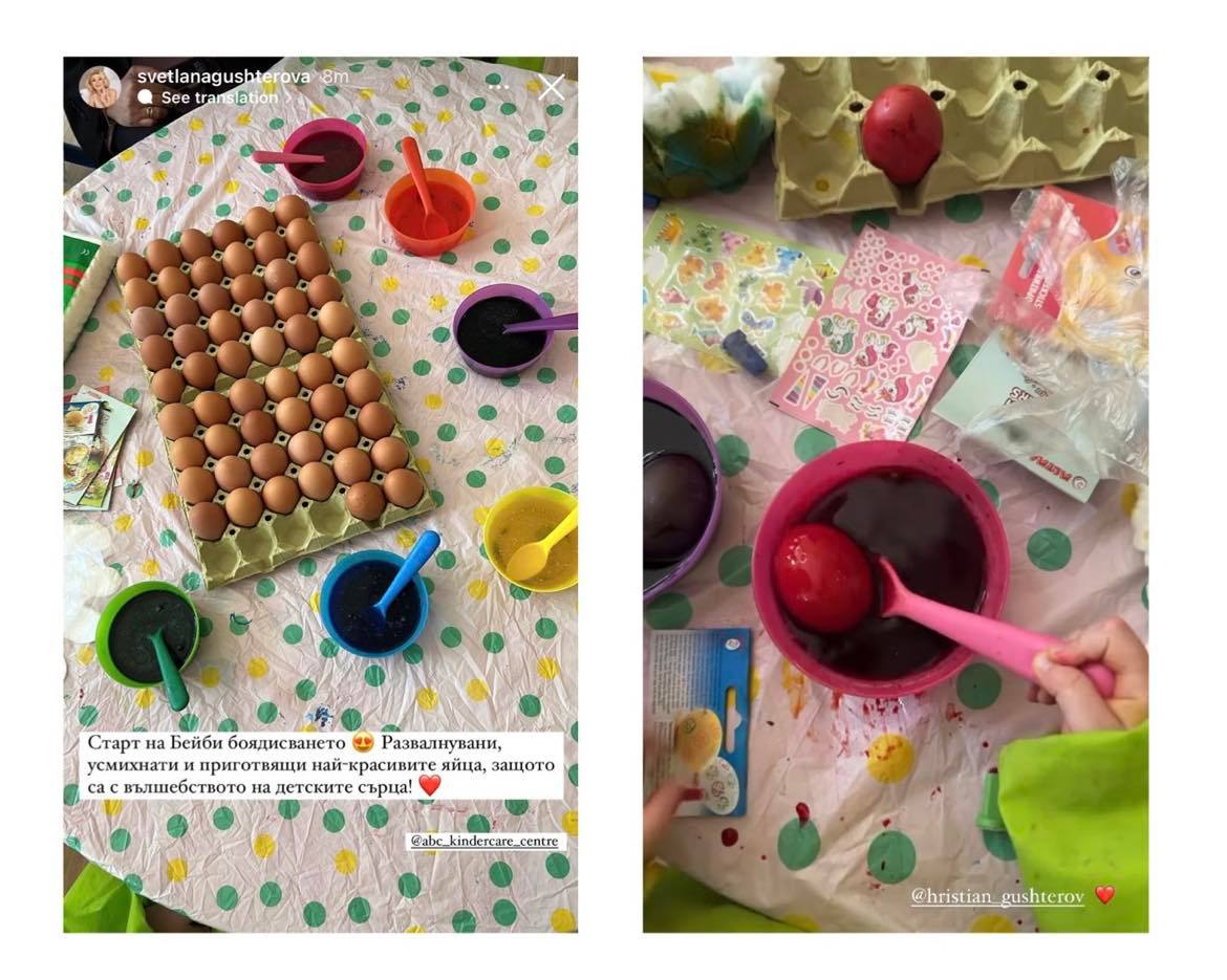 Многолюдното семейство се подготви солидно за Великденските празници - бояджиите оцветиха цели две кори яйца, забеляза "Хотнюз". Бройката им не е изненада, тъй като къщата на Гущерови винаги е пълна - освен Светлана, Христиан и трите им деца, там живеят майката на Гущерова - Кунка, както и няколко гледачки.