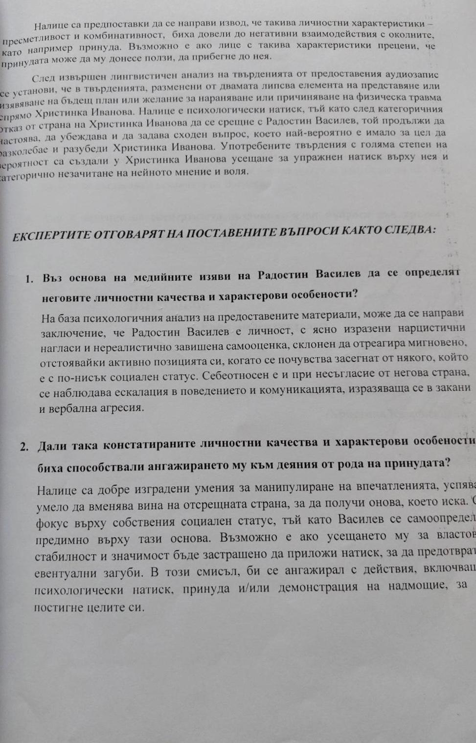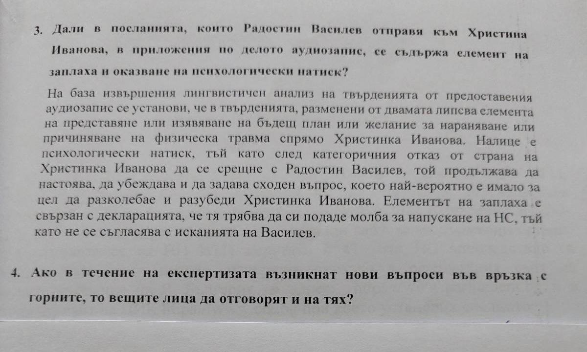 Експертизата на Радостин Василев е по досъдебно производство № 299/22 г., по което Радостин Василев е проверяван и разследван за отправени от него на 13 юни 2022 година заплахи, с които се е опитал да принуди депутатката Христинка Иванова да напусне парламентарната група на "Има такъв народ" и 47-ото Народно събрание.