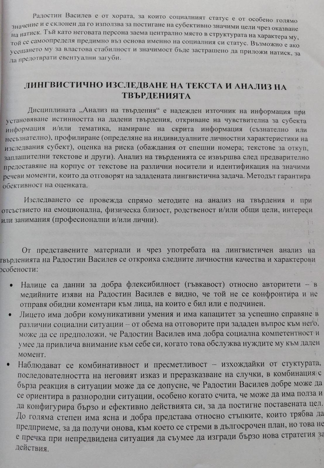 Способен е да погазва принципи и норми, когато, в процеса на професионално или йерархично израстване, се сблъска с препятствия… Има добре изградени умения за манипулиране на впечатленията, служи си добре с похвати, свързани с вменяване на вина на отсрещната страна, за да получи онова, което иска…. Наблюдава се комбинативност и пресметливост … Възможно е, ако усещането му за властова стабилност и значимост бъде застрашено, да приложи натиск, за да предотврати евентуални загуби", са само малка част от заключенията на криминален психолог и психолог/криминален лингвист, изготвили характеристиката.