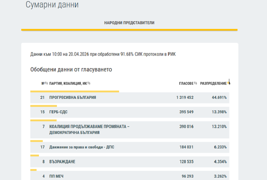 ЦИК публикува на сайта си нови междинни резултати при обработени 91.68% протоколи. Данните са към 10 часа тази сутрин.