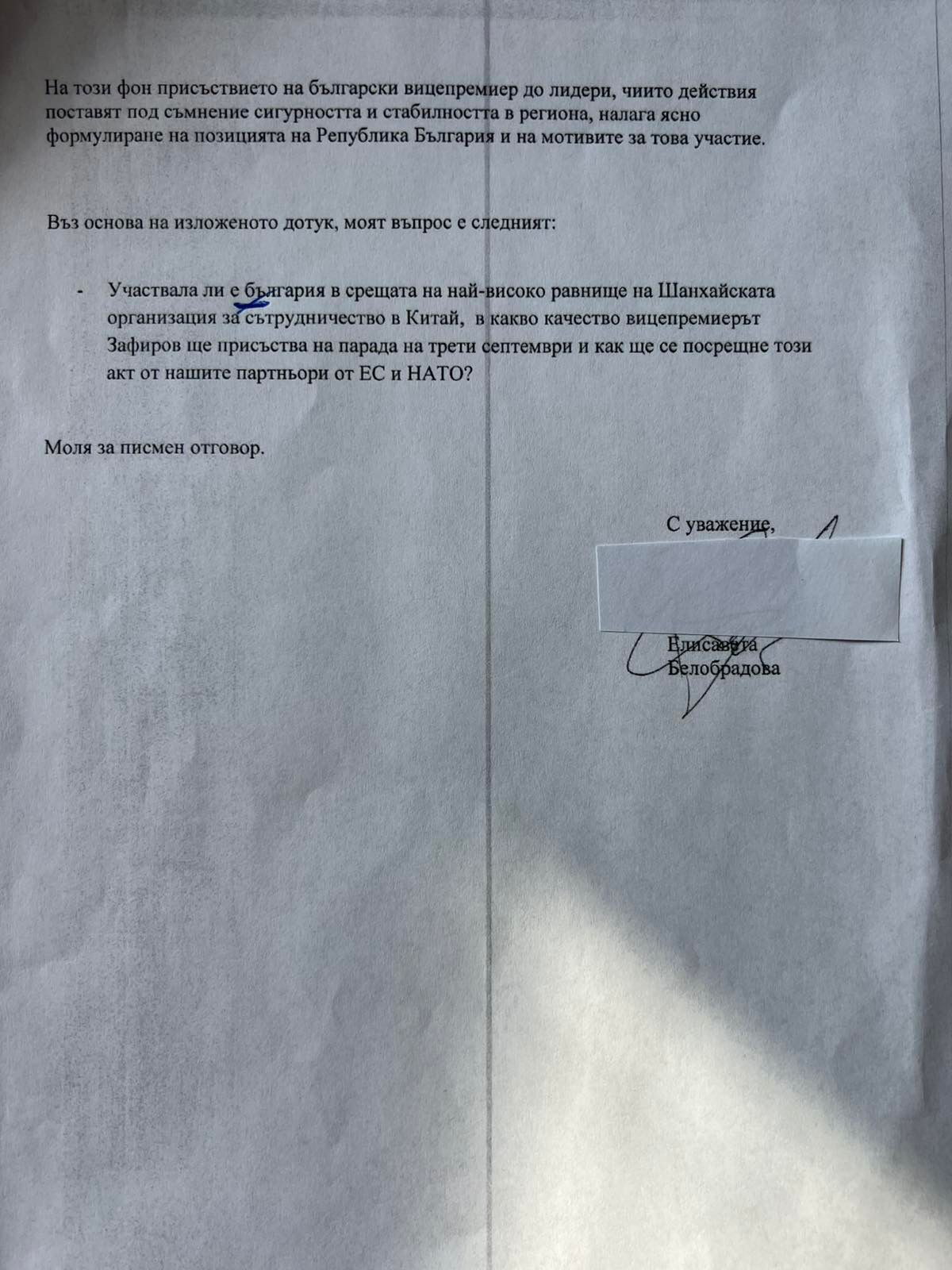 Народният представител от ПП-ДБ Елисавета Белобрадова отново се оказа в центъра на внимание – този път не заради поредното си ексцентрично изказване, а заради елементарна, но показателна неграмотност: в официален писмен въпрос, внесен в качеството ѝ на депутат, тя изписва името на страната ни с малка буква – „българия“.