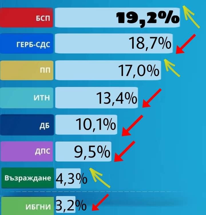Според графиката, която се разпространява из групите на бесепарите, столетницата е първа политическа сила с 19,2%, а ГЕРБ е на второ място с 18,7%. Надолу са "Продължаваме промяната" със 17%, "Има такъв народ" с 13,4%, ДБ с 10,1% и ДПС с 9,5%.