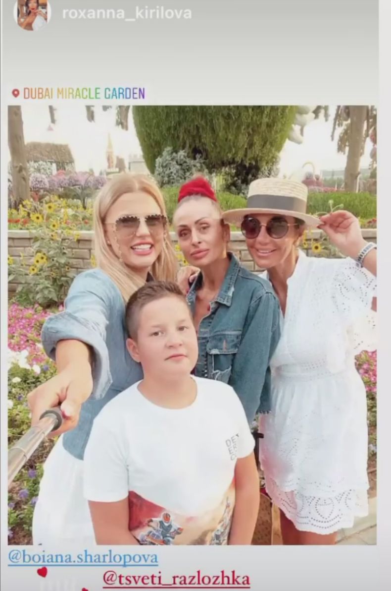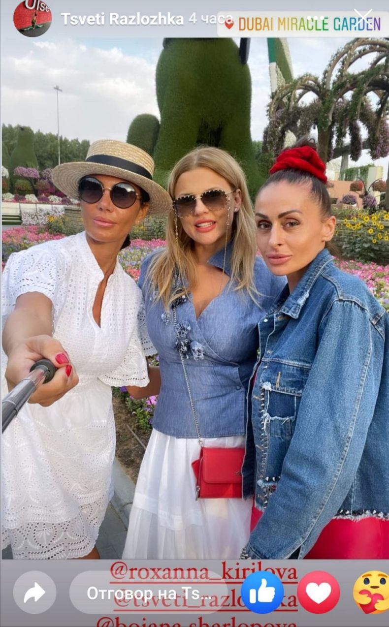 За почивката й в емирството обаче я издаде Цвети Разложка. Миската, която е известна с участието си в "Сървайвър" и с титлите си "Мис Самоков", "Лейди България", "Senora Clasica Mondial", "Lady Top Model Worldwide", "Fashion Idol 2011" и други, изпорти заверата с няколко сторита на дамската компания.