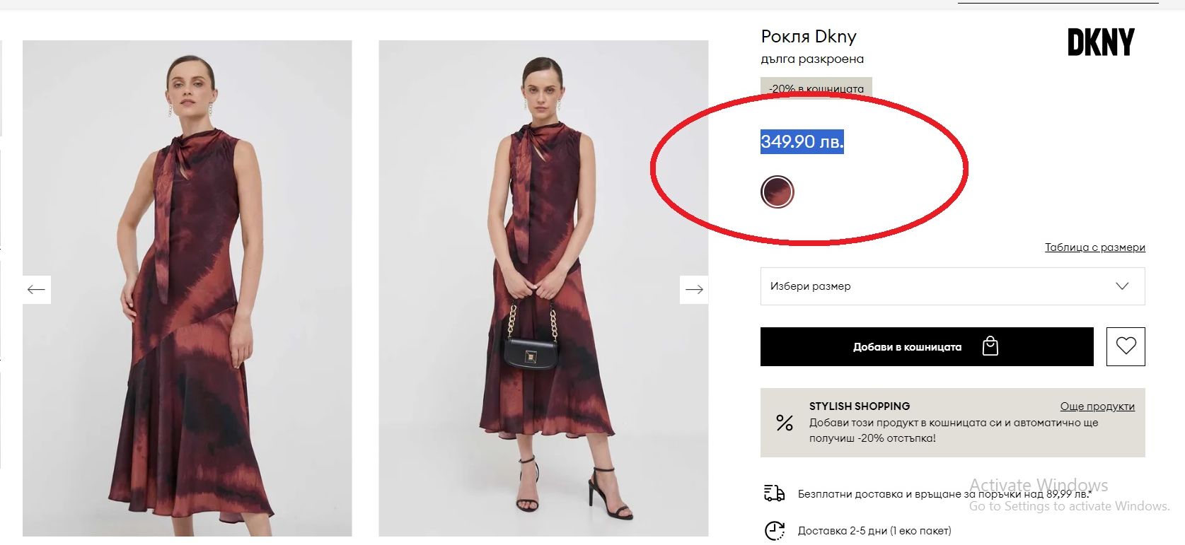 Проверка на ПИК обаче показа, че дрехата е на "Donna Karan". В официалния сайт на базираната в Ню Йорк модна къща е обявена цена от $ 150, но може да купи и от български сайтове за дамска мода срещу 349.90 лв.