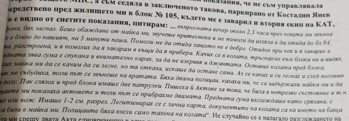 Отидох при нея и я заварих разстроена и я помолих да я закарам вкъщи, да я прибера. Качих се в колата, тръгнахме към блока ни и видях, че едната гума е спукана и карах внимателно, за да не изкривя джантата. Оставих колата пред блока, помолих майка ми да се качим да си легне, но тя отказа, искаше да остане сама. Аз се качих и си легнах и след половин час ме събудиха, този път се звънеше на вратата. Бяха двама полицаи, казаха ми, че са задържали майка ми и да сляза долу. Пак слязох и пред блока имаше две патрулки. Пишеха й актове, за това, че била в нетрезво състояние и т.н. Полицаите ми показаха актовете и този път се прибрахме двамата", разказва в показанията си Костадин Янев.