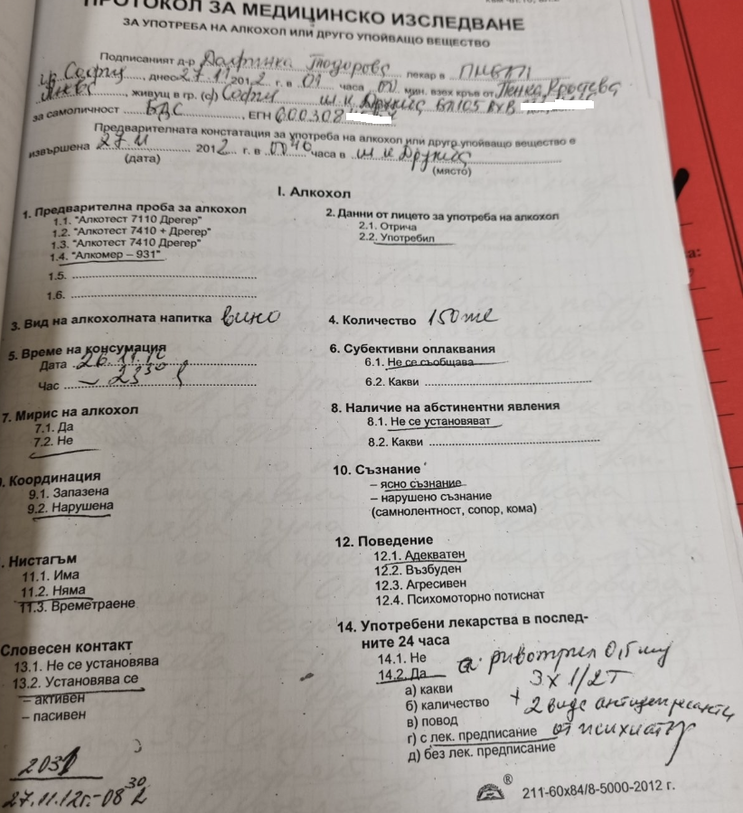 Дрегерът отчита 1,47 промила. Полицаите се заемат да й съставят акт, но от написаните в него възражения е видно какъв е бил статусът на премиершата. Първоначално тя отказва да подпише акта, а на документите драсканиците са напълно неразбираеми.