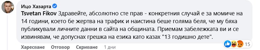 Tsvetan Fikov Здравейте, абсолютно сте прав - конкретния случай е за момиче на 14 години, което бе жертва на трафик и наистина беше голяма беля, че му бяха публикували личните данни в сайта на общината. Приемам забележката ви и се извинявам, че допуснах грешка на езика като казах "13 годишно дете".
