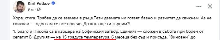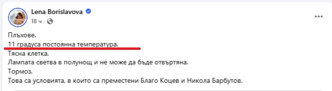 Днес Лена отново излезе с пост, в който натърти на опорката, че Коцев и Барбутов са принудени да живеят в затвора на 11 градуса постоянна температура.